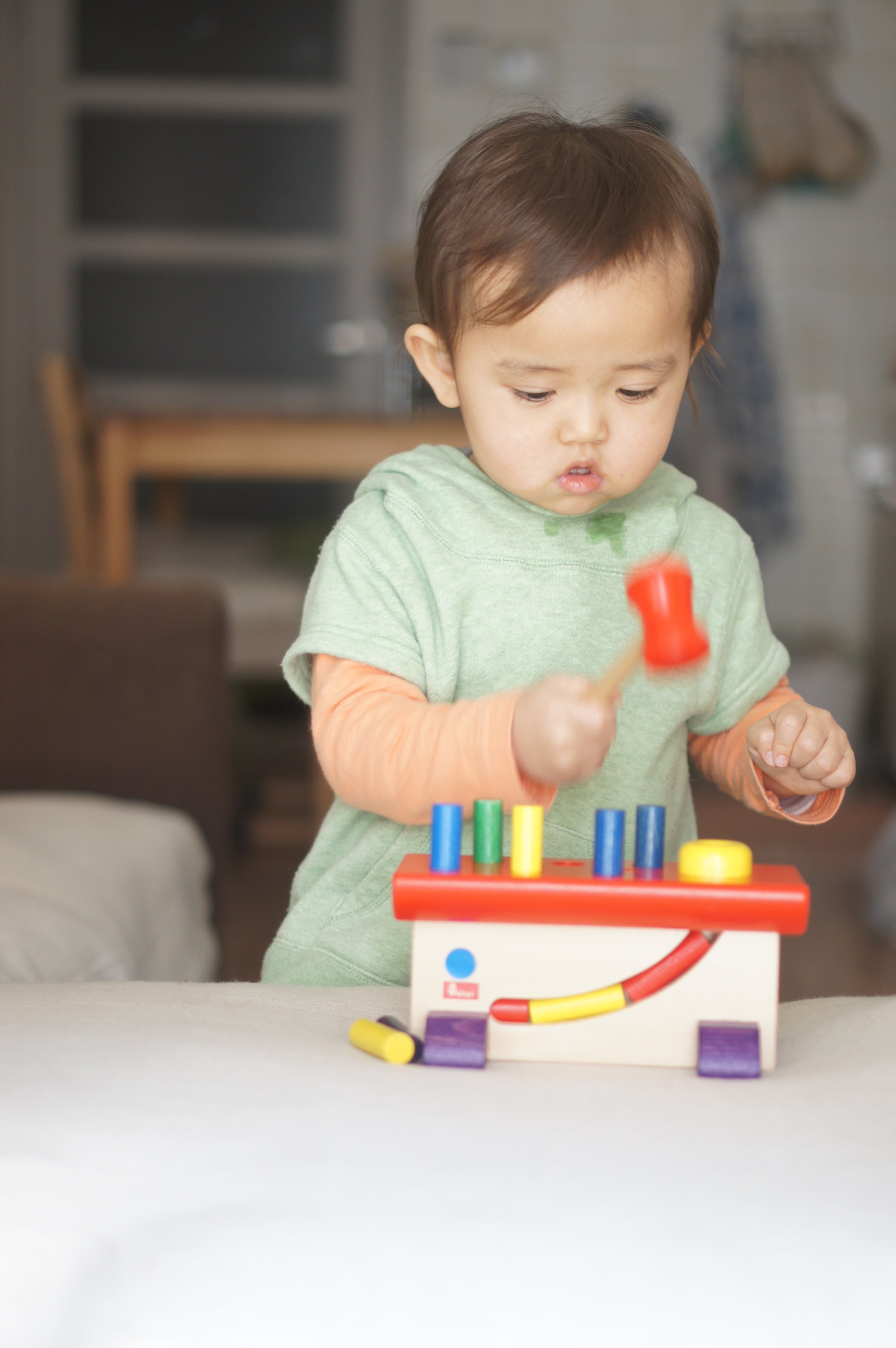 1歳半頃はハンマーなしで、ペグを指先や手の平で押して遊ぶのがオススメ!